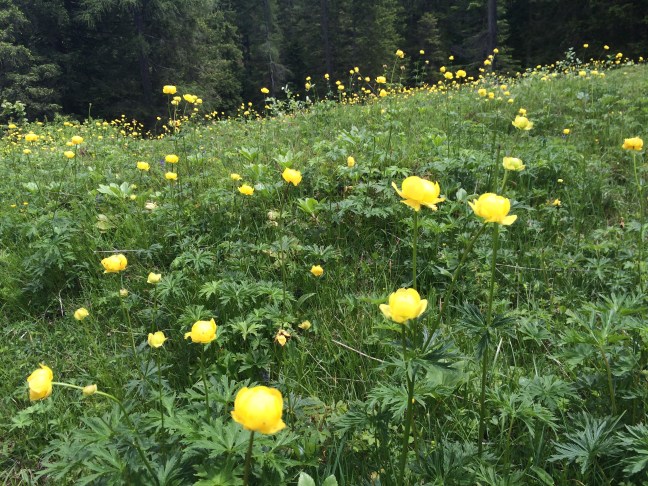 Auf meiner Wanderung dieses Wochenende begleiteten mich kilometerlang die Trollblumen mit ihren kugelförmigen, gelben Blüten. Trollblumen (Trollius europaeus) gehören zu den Hahnenfußgewächsen (Ranunculaceae) und sind – zumindest bei uns in Oberösterreich – geschützt. Der Name könnte sich wegen der runden Blüten vom Althochdeutschen „trol“ ableiten, oder aber auch vom lateinischen „trullus“, ein Begriff für kugelige Gefäße.