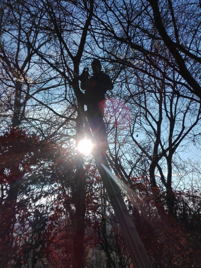 Erst wenn die Bäume laubfrei sind, kommt die Struktur des Gartens so richtig zur Geltung. Der urplötzlich ganz dringliche Wunsch einen alten Nadelbaum von den unteren Ästen zu befreien um einen Ausblick in die Landschaft zu bekommen wurde heute endlich erfüllt. Dieses Gefühl „heute, jetzt und auf der Stelle“ kenne ich aus einem anderen Bereich: mit dem Friseur warte ich auch immer bis zum letzten Moment, ehe ich eines Tages aufwache, einen Blick in den Spiegel werfe, um mich auf der Stelle einen Termin Friseurtermin zu kümmern, keinen Tag länger will ich dann warten. So ähnlich ging es mir mit dem Garten im Herbst. Dank der Hilfe lieber Freunde, deren Motorsäge und Häcksler wurde heute ordentlich im Garten gewerkt. Gemeinsam macht es einfach noch mehr Spaß.
